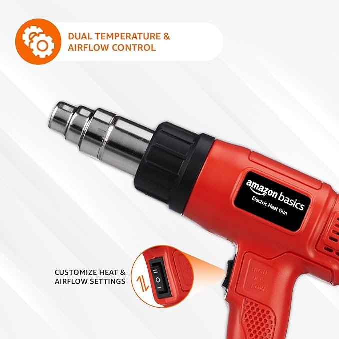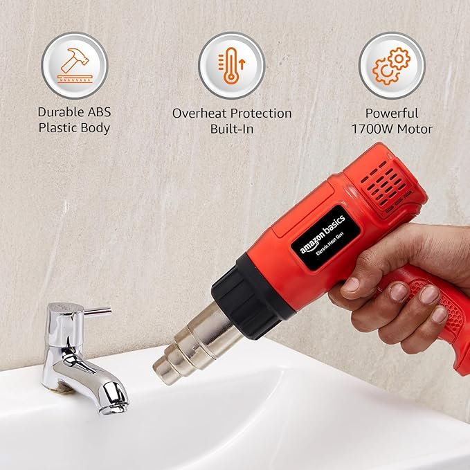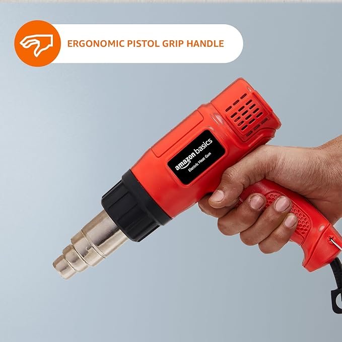 - 1700W High-Performance Motor Provides consistent hot air output, perfect for DIY projects and everyday heating applications. Dual Temperature & Airflow Settings Customize heat output based on your task with adjustable airflow and temperature controls. Multi-Purpose Utility Tool Ideal for paint stripping, varnish drying, adhesive removal, soldering, plastic welding, cable shrinking, and more. Comfortable Pistol Grip Design Ergonomically crafted handle offers better control and reduced hand fatigue. Overheat Protection Feature Automatically powers down in case of overheating, ensuring safe usage.Durable ABS Plastic Housing Built to withstand regular use in home, garage, or jobsite environments. In-the-Box Includes 1 heat gun, 1 nozzle attachment, and 1 user manual. Warranty & Dimensions Comes with 6 months warranty. Product Dimensions: 217 mm x 68 mm x 190 mm. Color: Red.