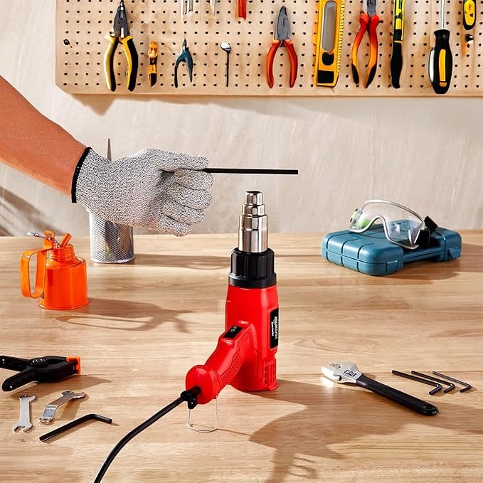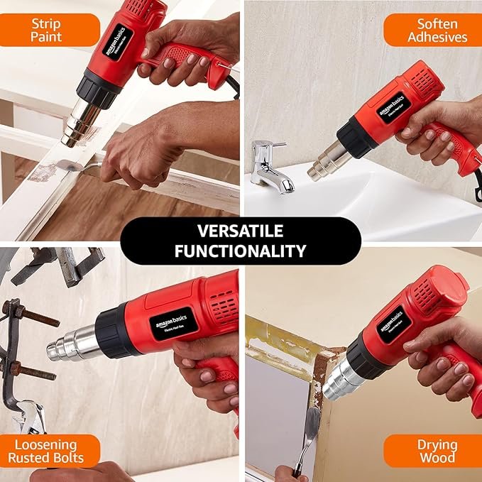 - 1700W High-Performance Motor Provides consistent hot air output, perfect for DIY projects and everyday heating applications. Dual Temperature & Airflow Settings Customize heat output based on your task with adjustable airflow and temperature controls. Multi-Purpose Utility Tool Ideal for paint stripping, varnish drying, adhesive removal, soldering, plastic welding, cable shrinking, and more. Comfortable Pistol Grip Design Ergonomically crafted handle offers better control and reduced hand fatigue. Overheat Protection Feature Automatically powers down in case of overheating, ensuring safe usage.Durable ABS Plastic Housing Built to withstand regular use in home, garage, or jobsite environments. In-the-Box Includes 1 heat gun, 1 nozzle attachment, and 1 user manual.