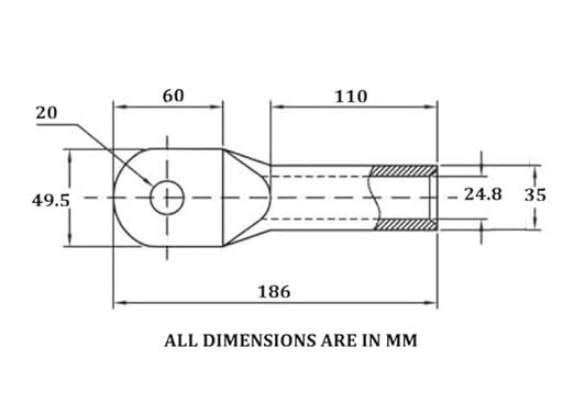 PRODUCT TYPE: Heavy-duty aluminium cable termination lug designed for secure and reliable electrical connections in power distribution systems,CABLE COMPATIBILITY: Specifically engineered for terminating 400 sq mm cables, ensuring proper fit and optimal electrical conductivity,DURABLE CONSTRUCTION: Made from high-grade aluminium material for long-lasting performance and resistance to corrosion in demanding electrical applications, PRECISE DIMENSIONS: Total length of 186mm, barrel diameter of 24.8mm, pad dimensions of 60mm x 49.5mm with 20mm mounting hole for secure installation, TECHNICAL SPECIFICATIONS: Barrel length of 110mm, pad thickness of 35mm, providing robust mechanical strength for industrial and commercial electrical installations