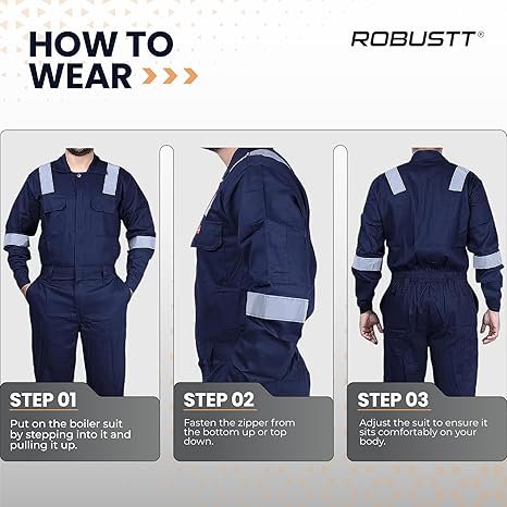 - Fastening and Closure: Robustt Boiler suit typically features a front zipper or button-up design, allowing for easy wearing and removal. This fastening mechanism enables workers to quickly don or doff the suit, saving time and effort during work shifts.