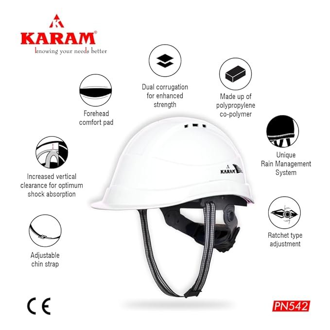 Choice Of Inner Harness: This safety helmet for industrial purposes offers a choice of inner harness. It is available in both webbing and polymer padding.Unique Design: With dual corrugation, KARAM’s safety helmet for men is equipped with protective peak, ventilated slots, a rain management system, and side slots for better face fitting.