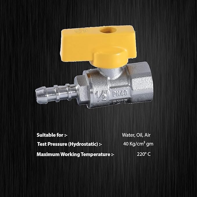 User-Friendly Design: Our Brass Nozzle Valve, Nickel Plated ART-1450G, features convenient female ends and a full bore two-piece design. Operate it effortlessly with a simple quarter turn and a lever for smooth functionality. Robust Performance: With a test pressure capacity of up to 40 kg/cm²gm and a maximum temperature tolerance of 220°C, this valve ensures reliable and robust performance in various conditions. Versatile Application: Tailored for everyday use, this valve is suitable for a wide range of applications. It can be confidently employed in different locations and is compatible with water, air, and oil, making it a versatile choice for your needs.
