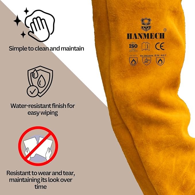 - MATERIAL QUALITY: Premium leather construction provides superior heat resistance and durability for welding and high-temperature work environments, PROTECTION COVERAGE: Full-length arm sleeves extend from wrist to upper arm, offering comprehensive protection against sparks and slag, COMFORT DESIGN: Elastic cuffs on both ends ensure secure fit while allowing freedom of movement during welding tasks ,VERSATILE USE: Suitable for welding, grinding, cutting, and other industrial applications requiring heat and spark protection